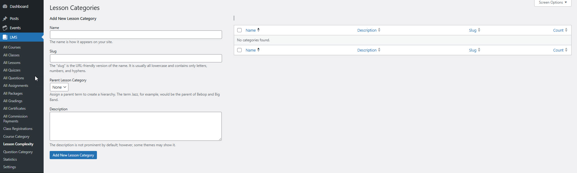 To create a new Lesson Category, navigate to **Dashboard > LMS > Lesson Categories** and click on **"Add New Lesson Category"**. Fill in the following fields:
