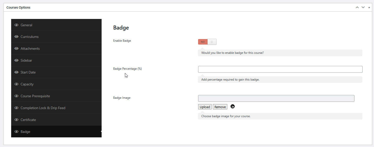 This section lets you configure badges for students based on their course performance. Badges are a great way to reward achievement and motivate learners.