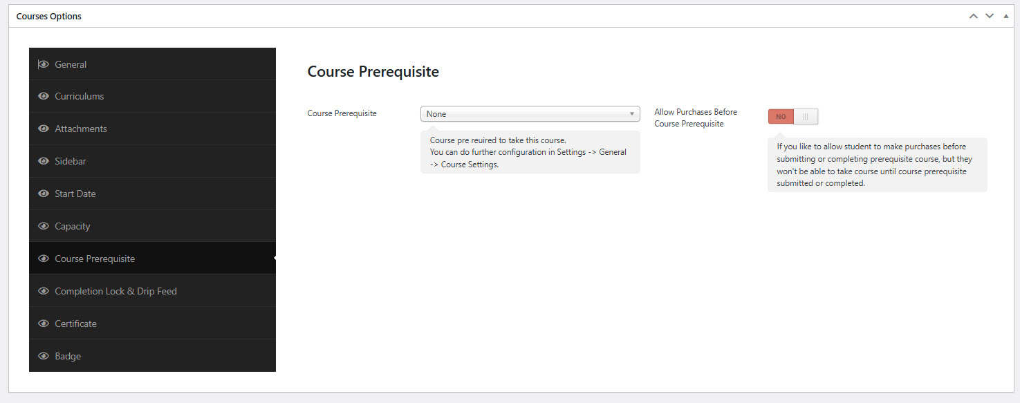 The Course Prerequisite section allows you to specify which course(s) must be completed before a student can access the current course.