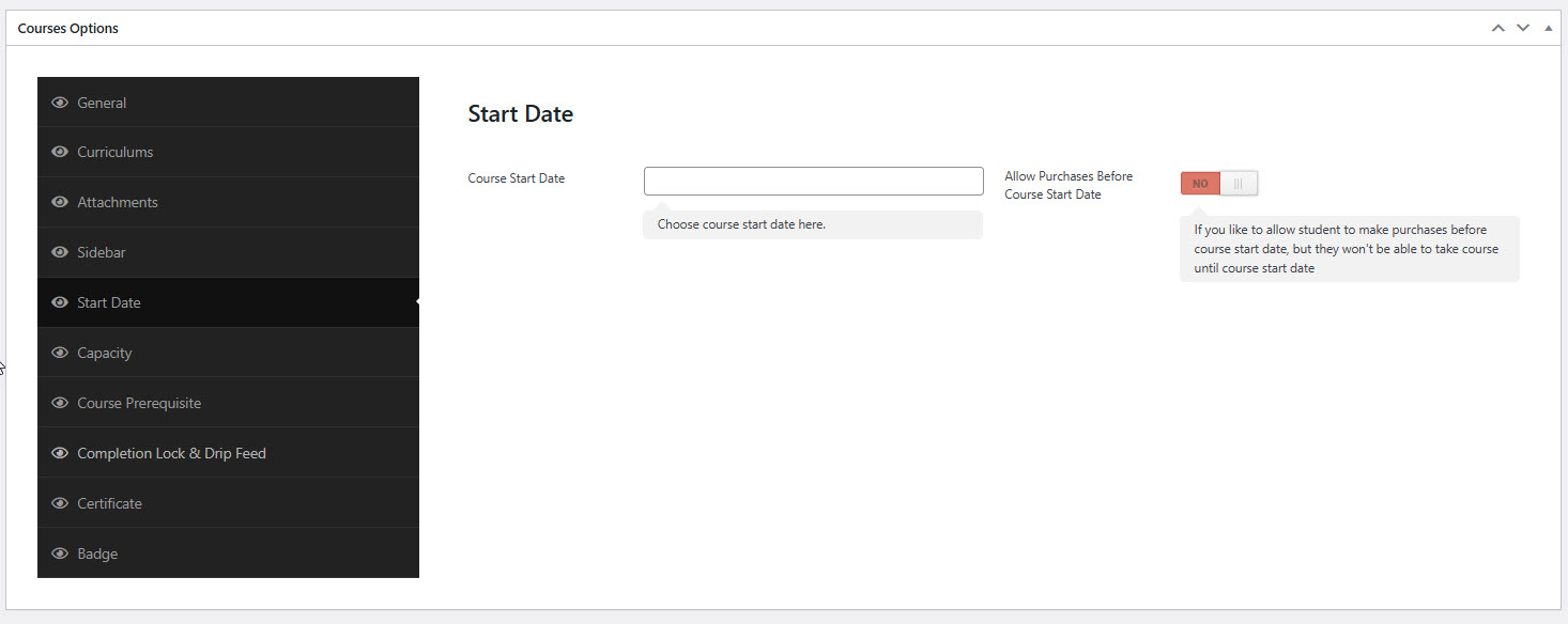 The Start Date section allows you to schedule when your course becomes accessible to enrolled students, and optionally allow early purchases before the course officially begins.