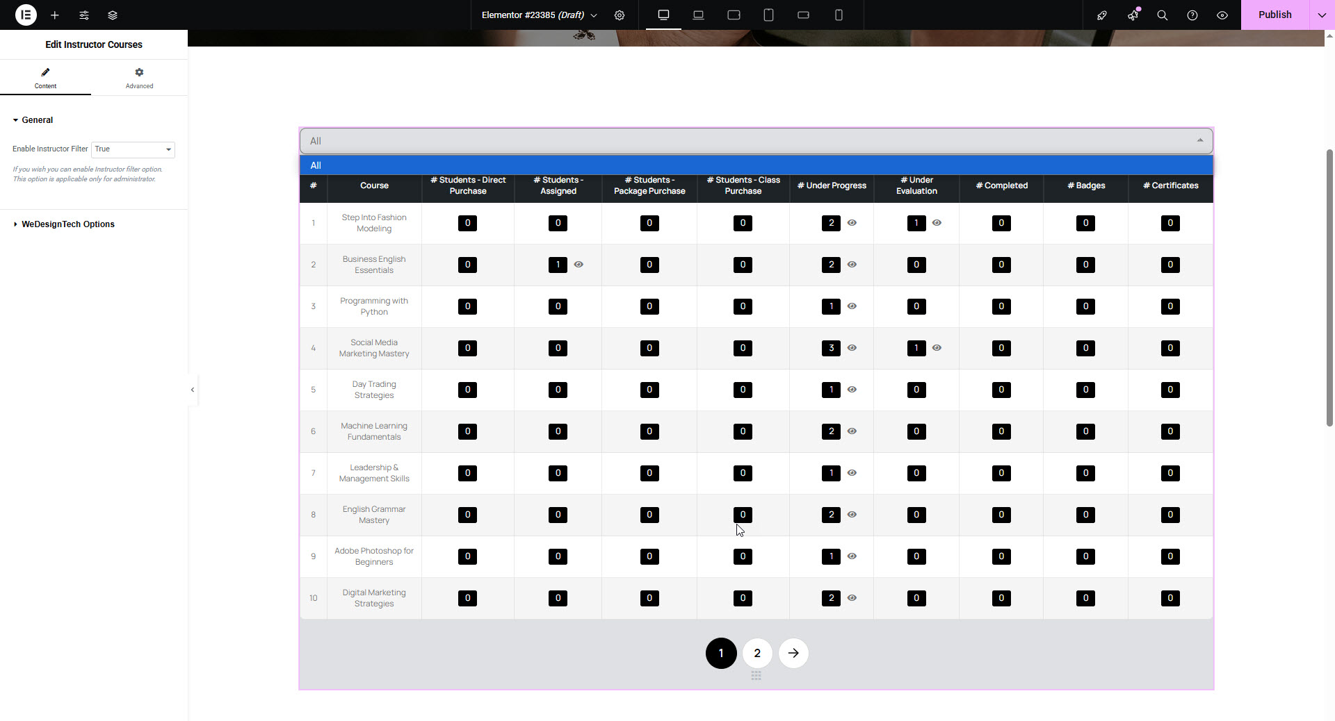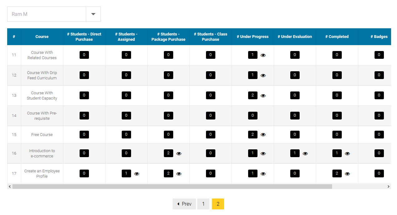 This shortcode is used to display the total courses created by all the instructors or from a particular instructor along with the details such as Students - Direct Purchase, Students - Assigned, Students - Package Purchase, Students - Class Purchase, Under Progress, Under Evaluation, Completed, Badges, Certificates of the particular course.