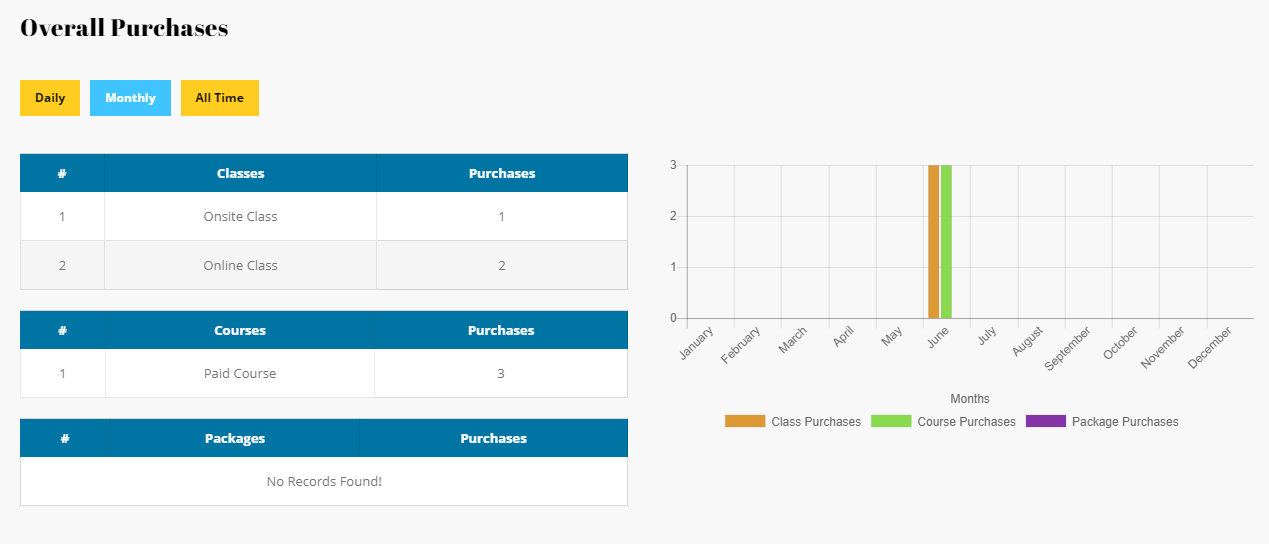 [dtlms_purchases_overview_chart chart-title="Overall Purchases" include-class-purchases="true" include-course-purchases="true" include-package-purchases="true" enable-instructor-filter="true" include-data="true" set-unique-colors="true"  first-color="#eeee22" second-color="#dd3333" third-color="#dd9933" class="custom-class"]