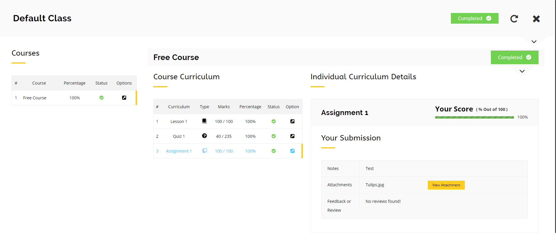 The **Student Class Curriculum Details Shortcode** shows the **curriculum progress of classes** that the **logged-in student** is enrolled in. It helps students track their learning within classes, including lessons, quizzes, and assignments grouped under a class.