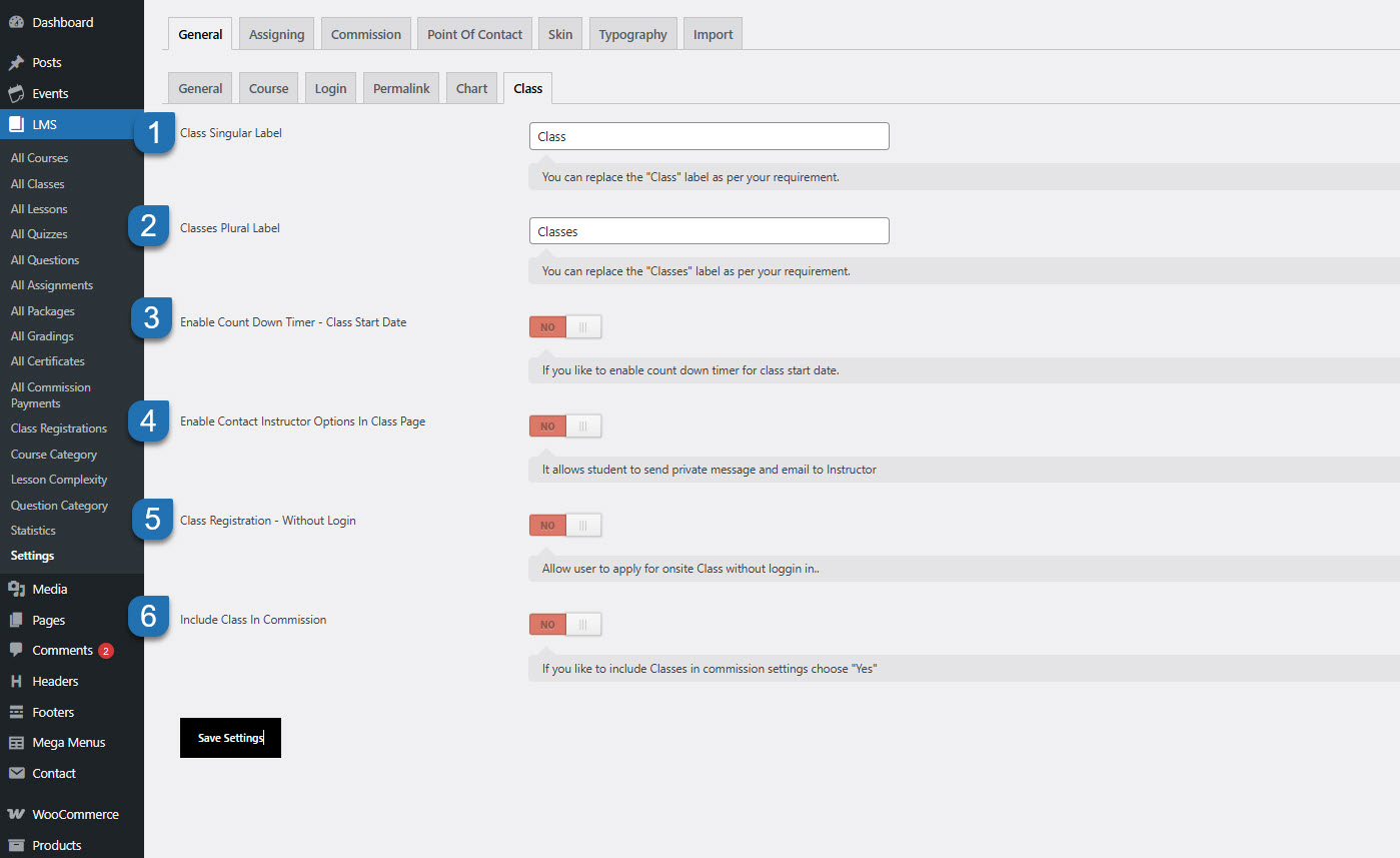 This section allows you to configure various class-related settings, including labels, communication options, and commission integration.